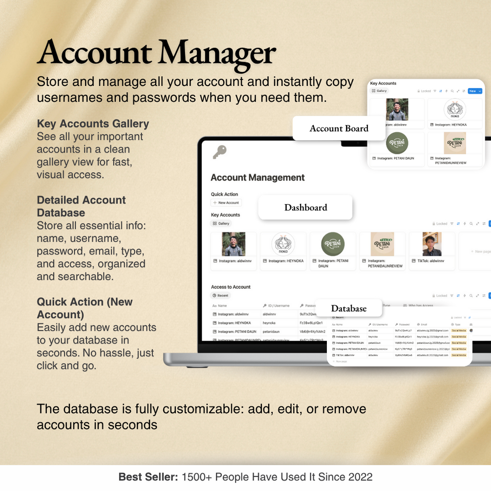 - Centralized Account Database: Store all your account details (username, password, email, account type, who has access) in one secure, easy-to-navigate dashboard.
