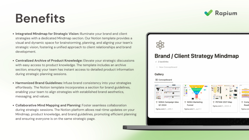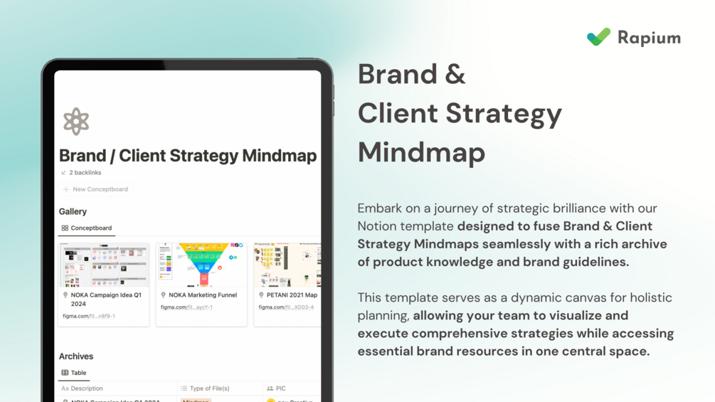 Optimize brand and client strategy development with our versatile Notion template. Seamlessly create and save mind maps in various formats such as PDF, PPT, or FigJam. Effortlessly visualize and organize key insights, goals, and action plans to drive success in your projects