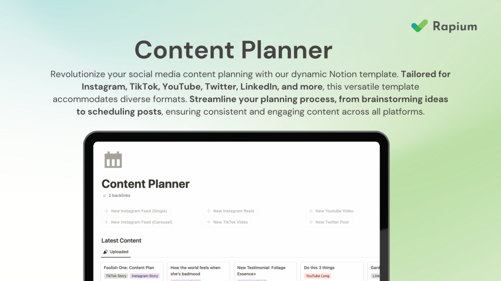 Revolutionize your social media content planning with our dynamic Notion template. Tailored for Instagram, TikTok, YouTube, Twitter, LinkedIn, and more, this versatile template accommodates diverse formats. Streamline your planning process, from brainstorming ideas to scheduling posts, ensuring consistent and engaging content across all platforms.