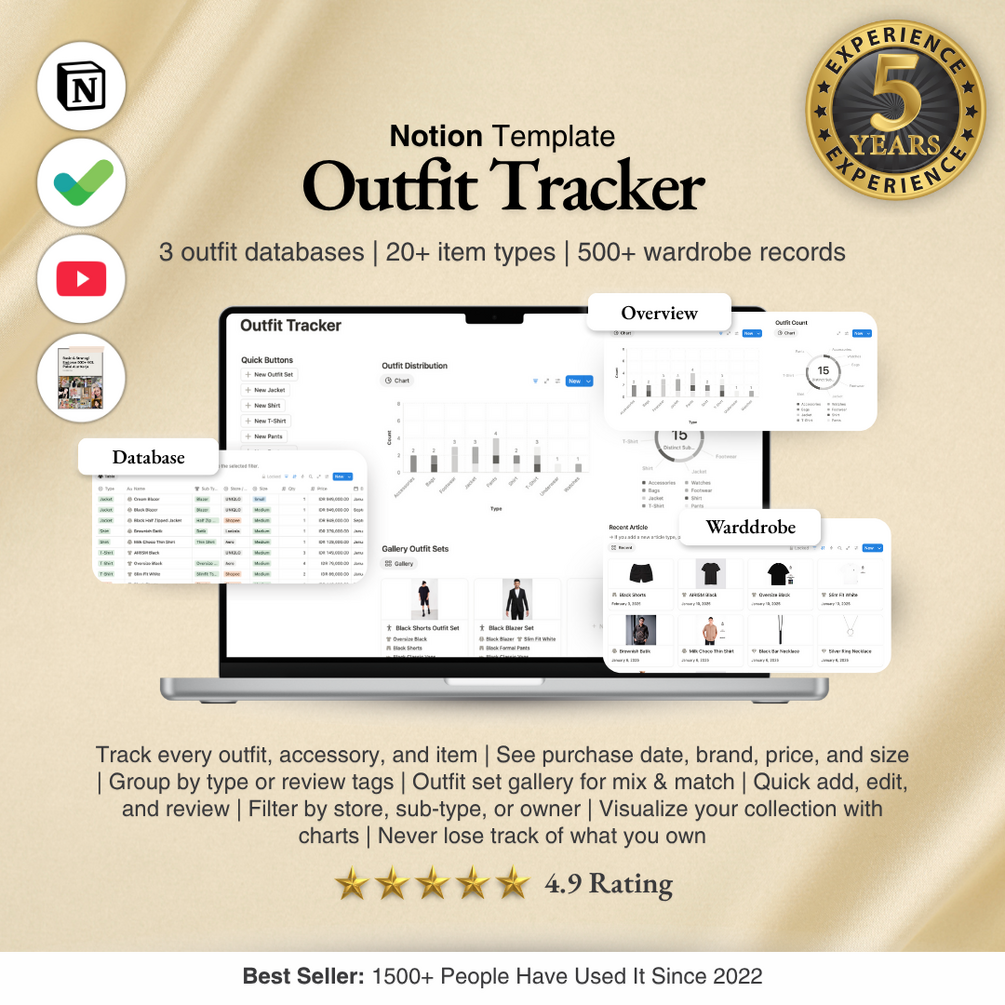This template lets you log every outfit and item, visualize your wardrobe with distribution and count charts, organize pieces with detailed fields and tags, and browse outfit sets—fully customizable, easy to use, and perfect for tracking personal or shared closets.