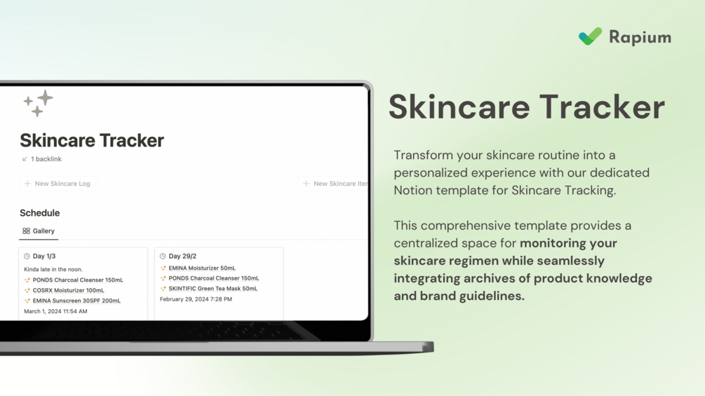 Revamp your skincare routine with Notion's Personal Skincare Tracker Template. Monitor products, routines, and progress. Achieve radiant skin effortlessly with personalized insights and reminders.
