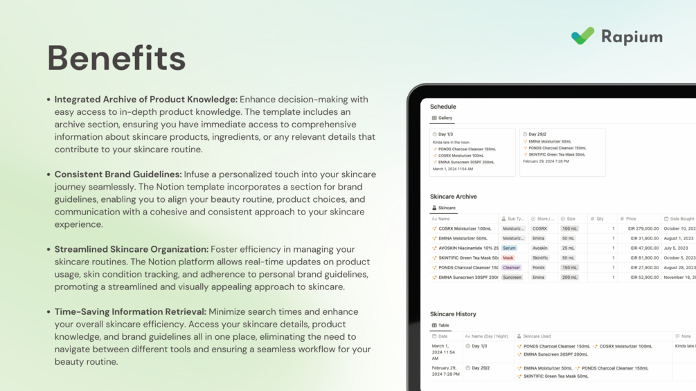 - Detailed information such as product type, store where to buy, size, quantity, price, day bought, and reviews, helping you make informed decisions about your skincare purchases.