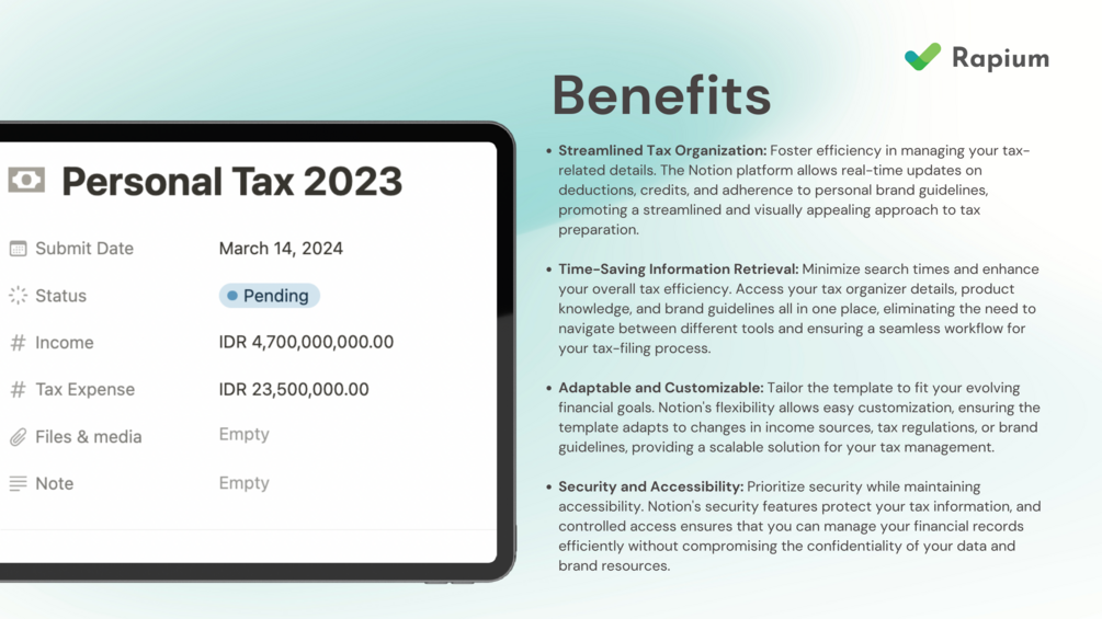 Ready to take control of your taxes with ease?. Duplicate this Notion template, customize it to fit your specific requirements, and empower your team to work smarter, not harder.
