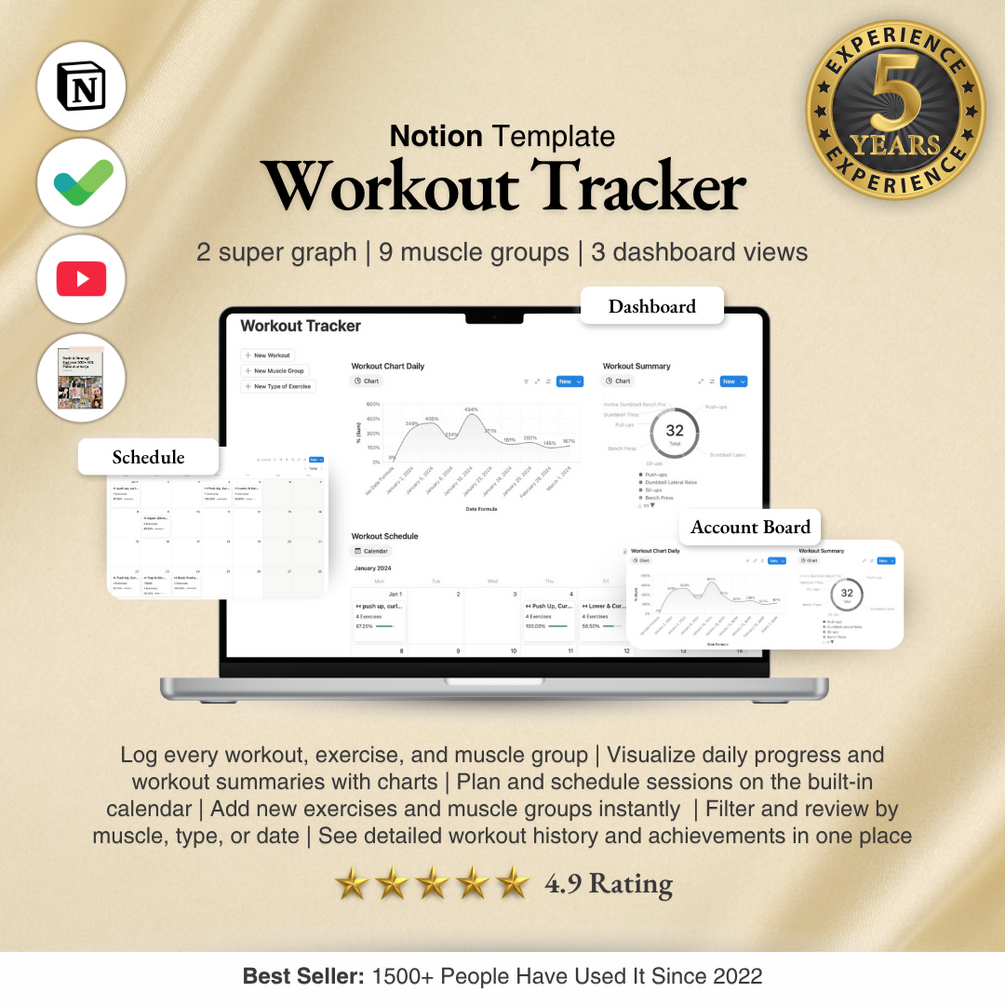 This template lets you log every workout, exercise, and muscle group, visualize your progress with charts and a calendar, and organize sessions with detailed fields—fully customizable, easy to use, and perfect for tracking serious training goals.